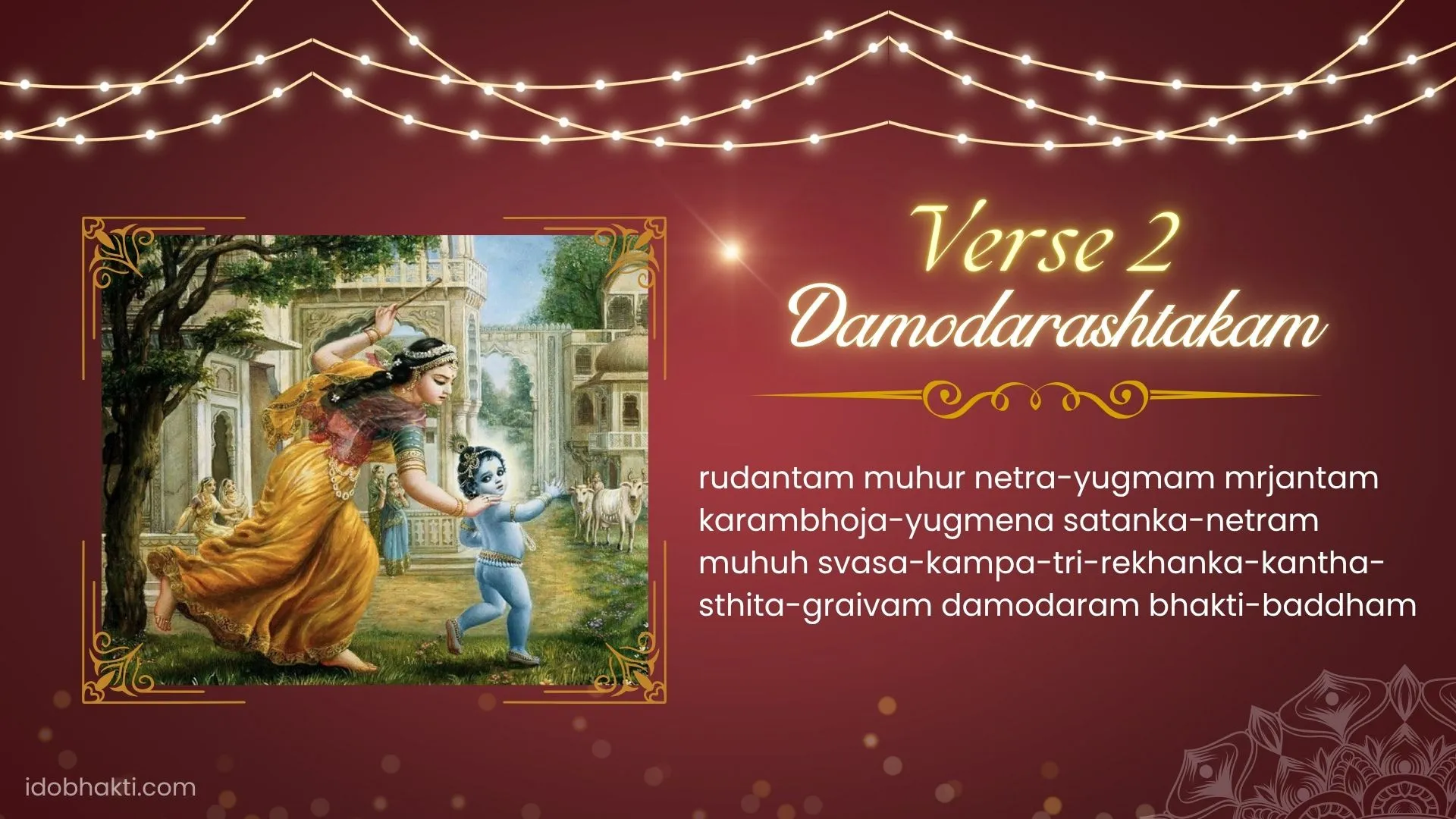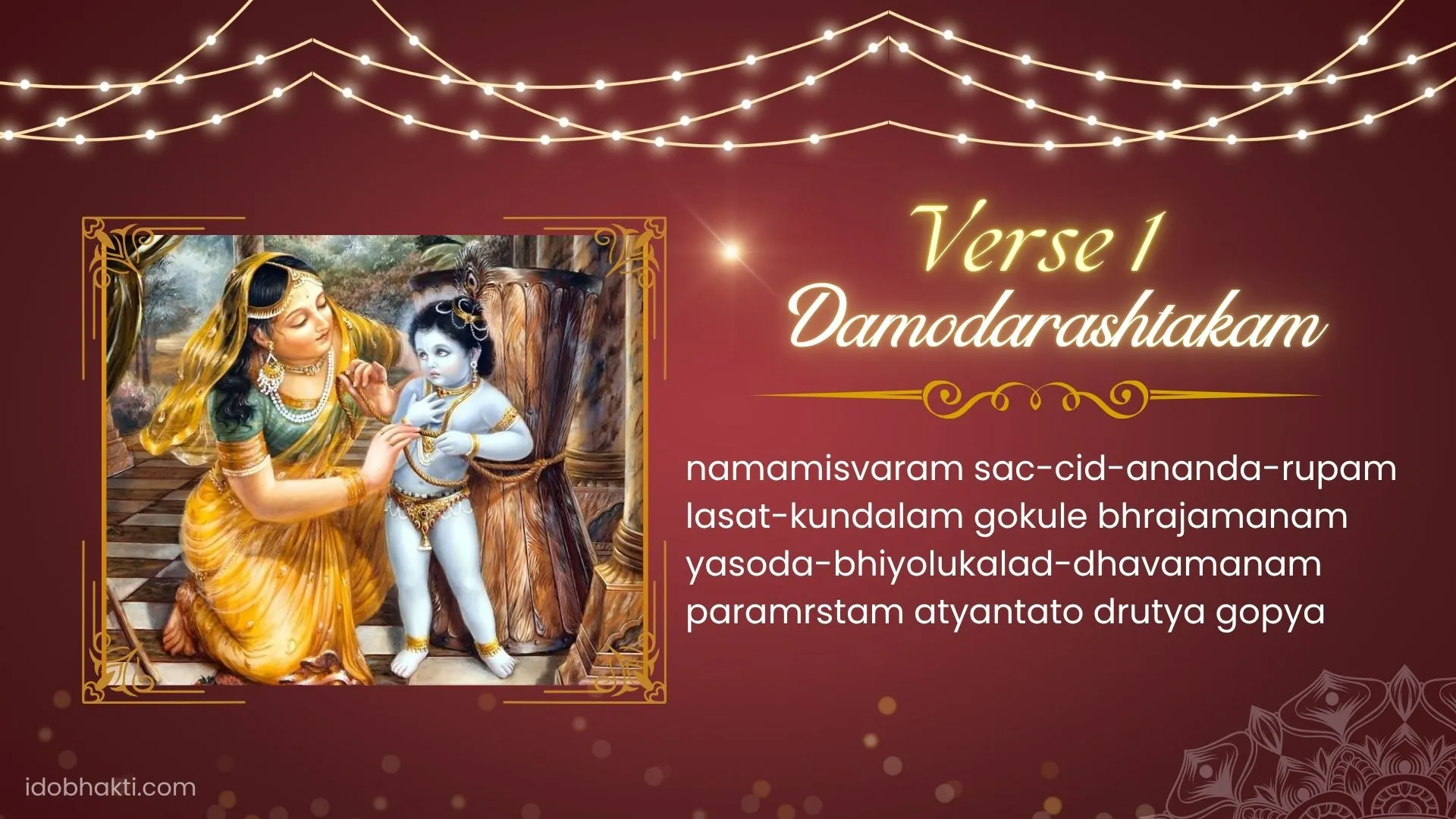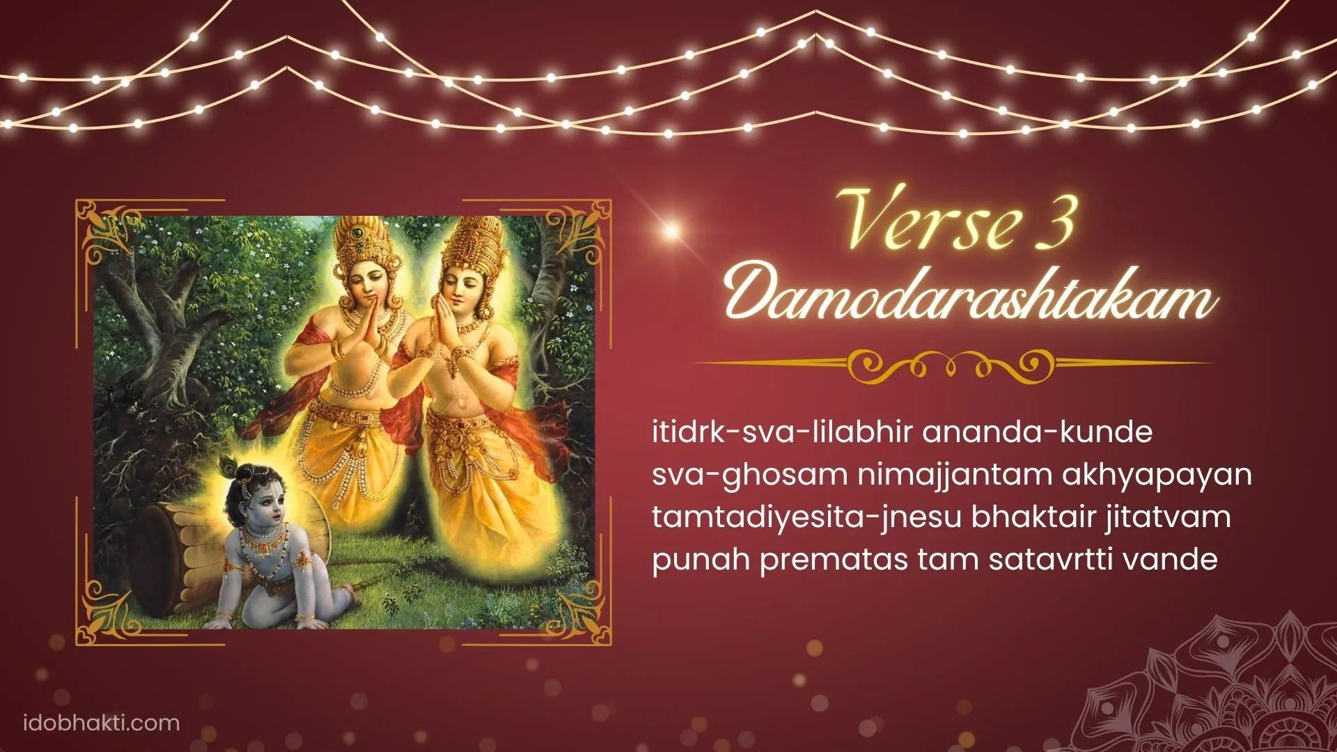 The Damodarashtakam is a beautiful prayer composed by Satyavrata Muni and written by Vyasa Deva. It describes the Damodara Lila of Lord Krishna, in which Mother Yashoda chases little Krishna, who is crying like an ordinary child. However, in reality, he is the Supreme Almighty Lord, the source of all creation, whose very existence makes even fear itself tremble.
