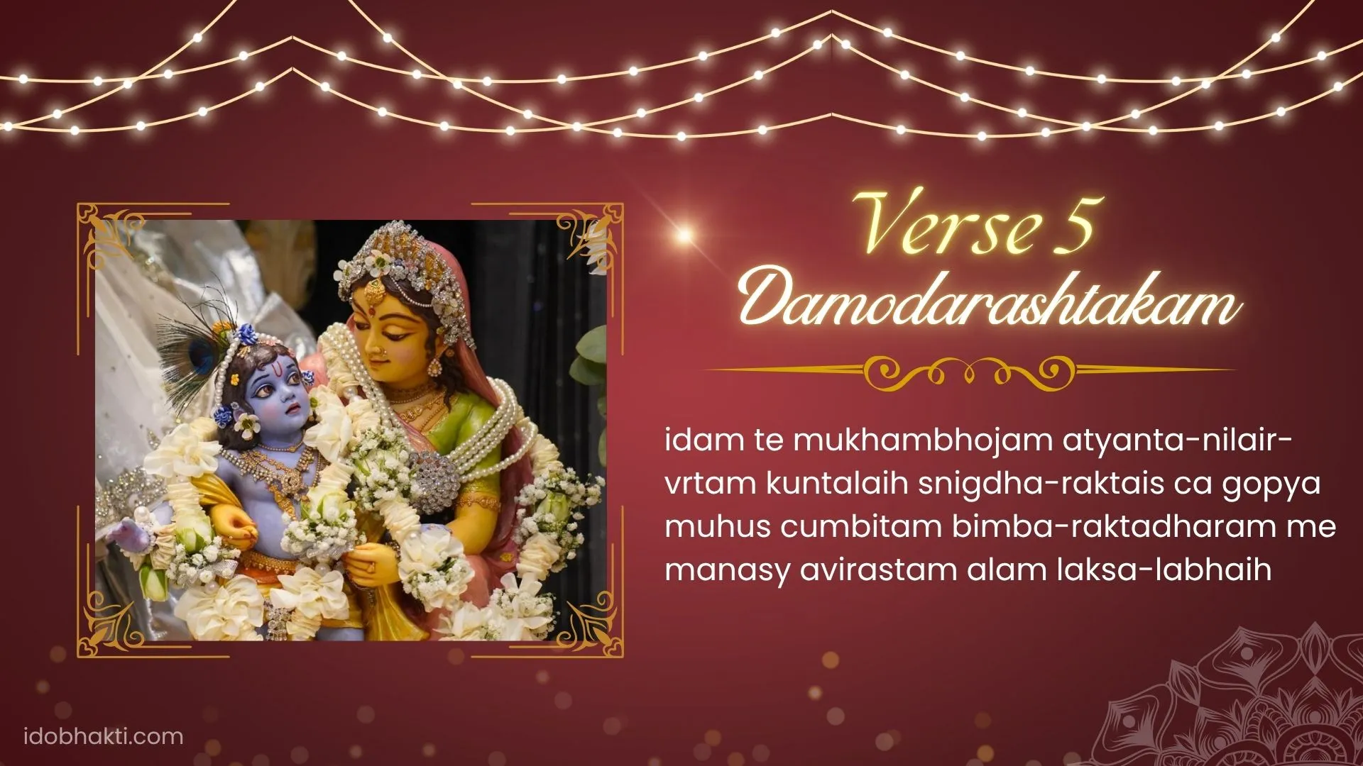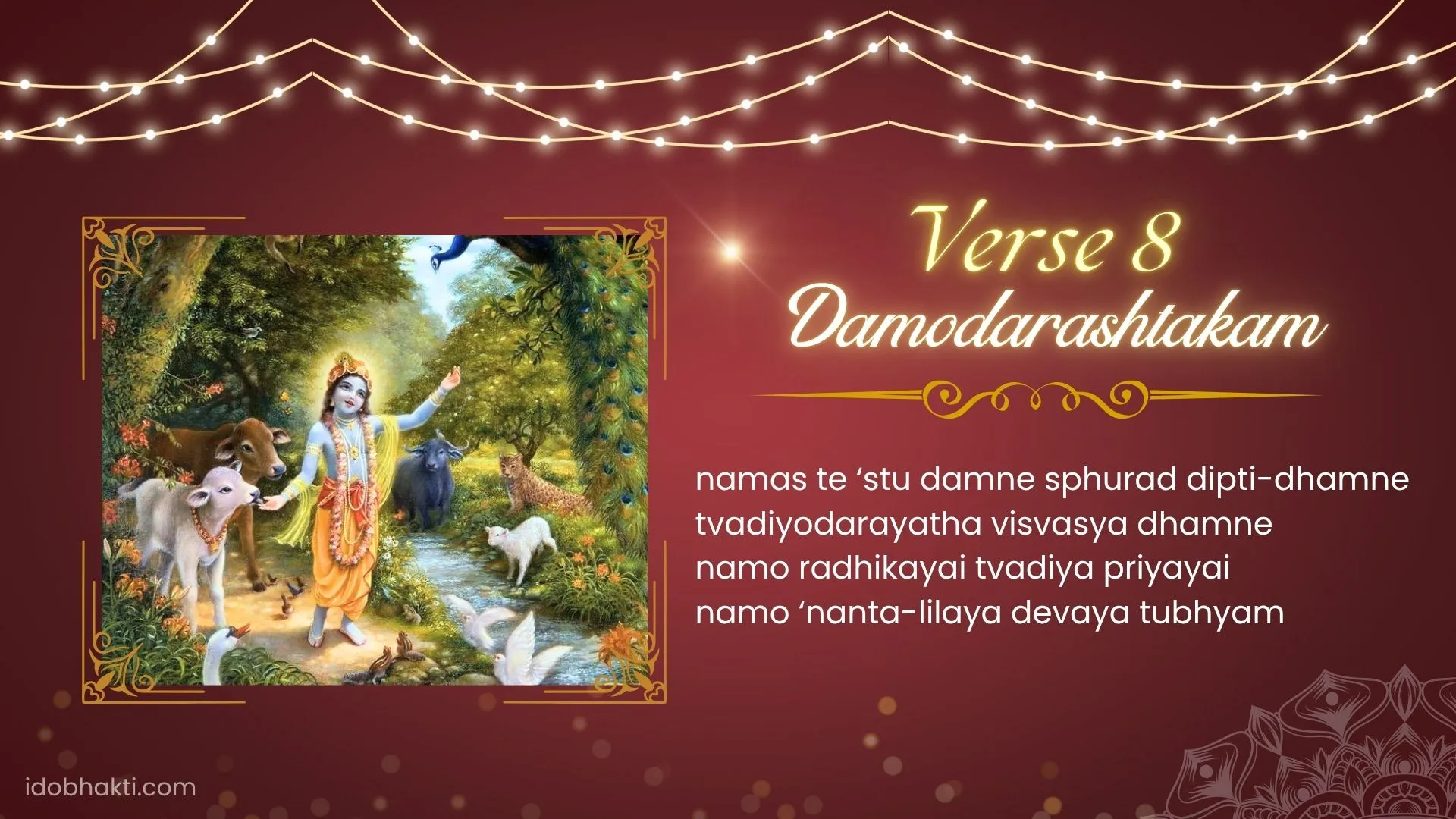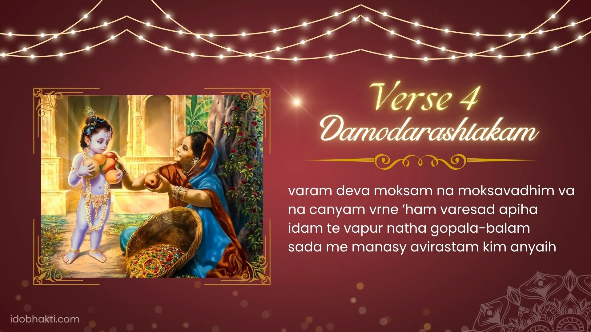 The Damodarashtakam is a beautiful prayer composed by Satyavrata Muni and written by Vyasa Deva. It describes the Damodara Lila of Lord Krishna, in which Mother Yashoda chases little Krishna, who is crying like an ordinary child. However, in reality, he is the Supreme Almighty Lord, the source of all creation, whose very existence makes even fear itself tremble.