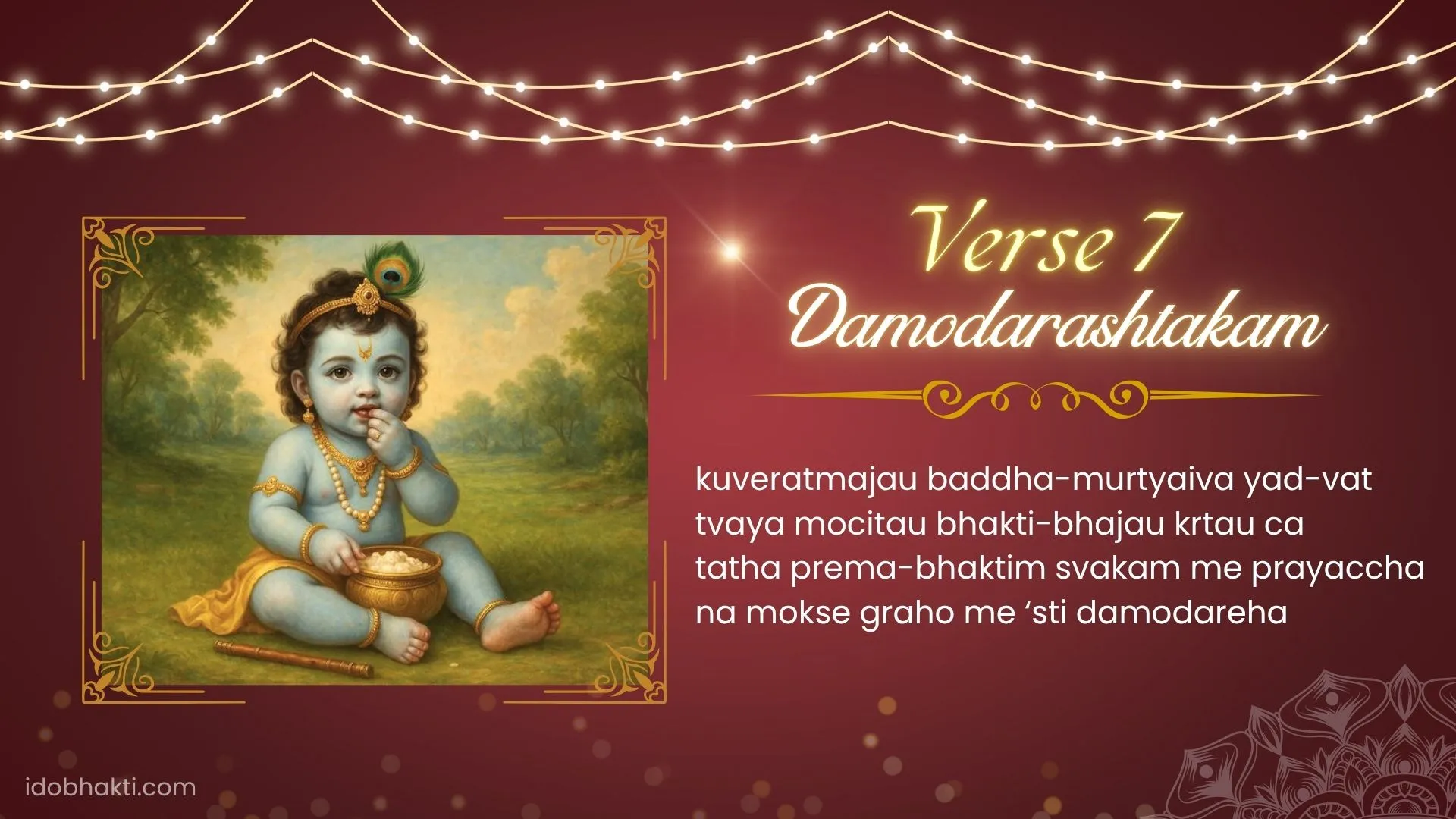 “O Lord Damodara, You liberated the sons of Kuvera, Manigriva and Nalakuvara, and made them devotees. Please give me that same love and devotion. I have no desire for liberation.”